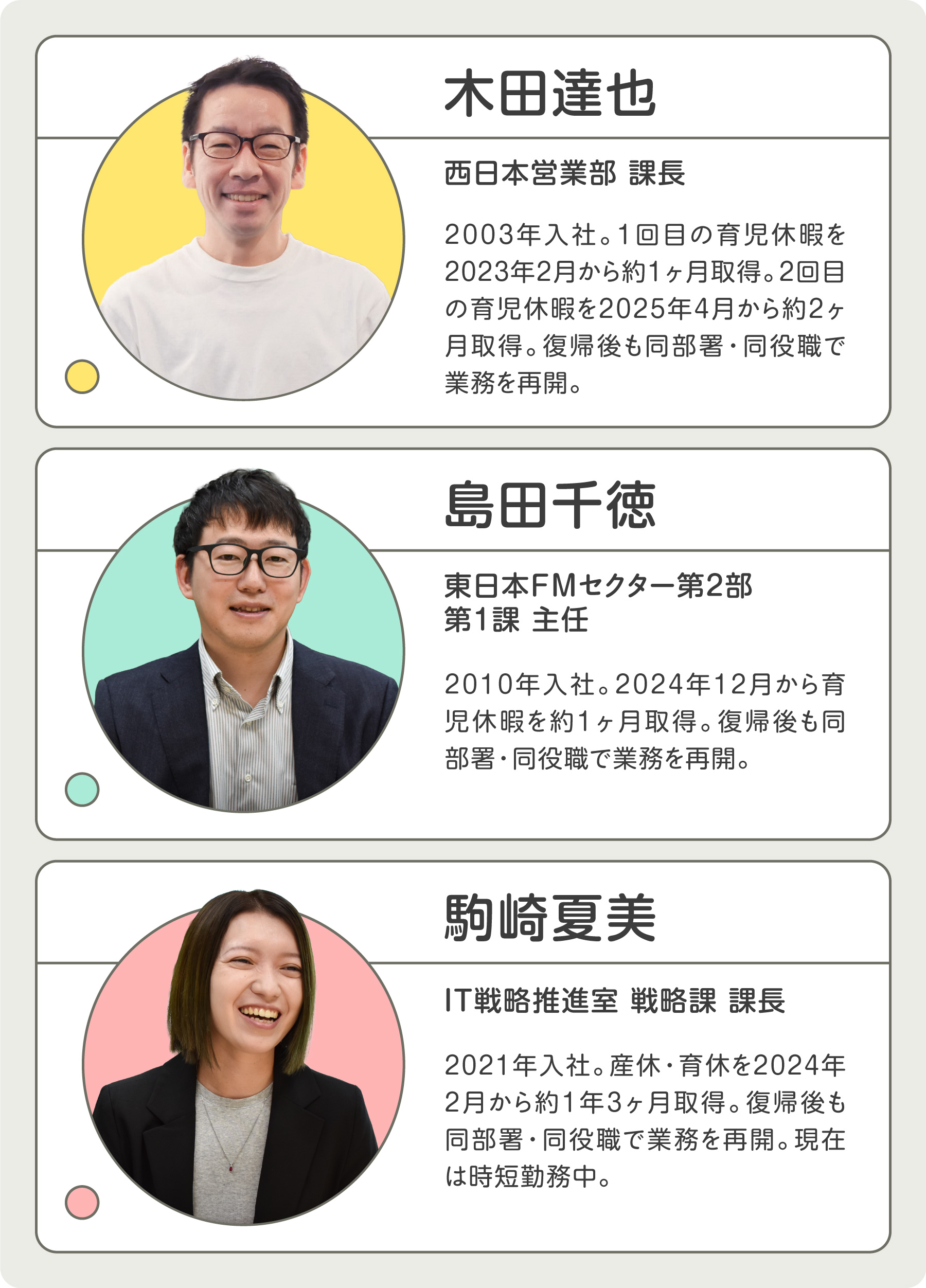 今回は、実際に育休を取得した3名に話を伺いました。子育てと仕事の「ワークライフバランス」を前提とする大成の文化を紐解きます。