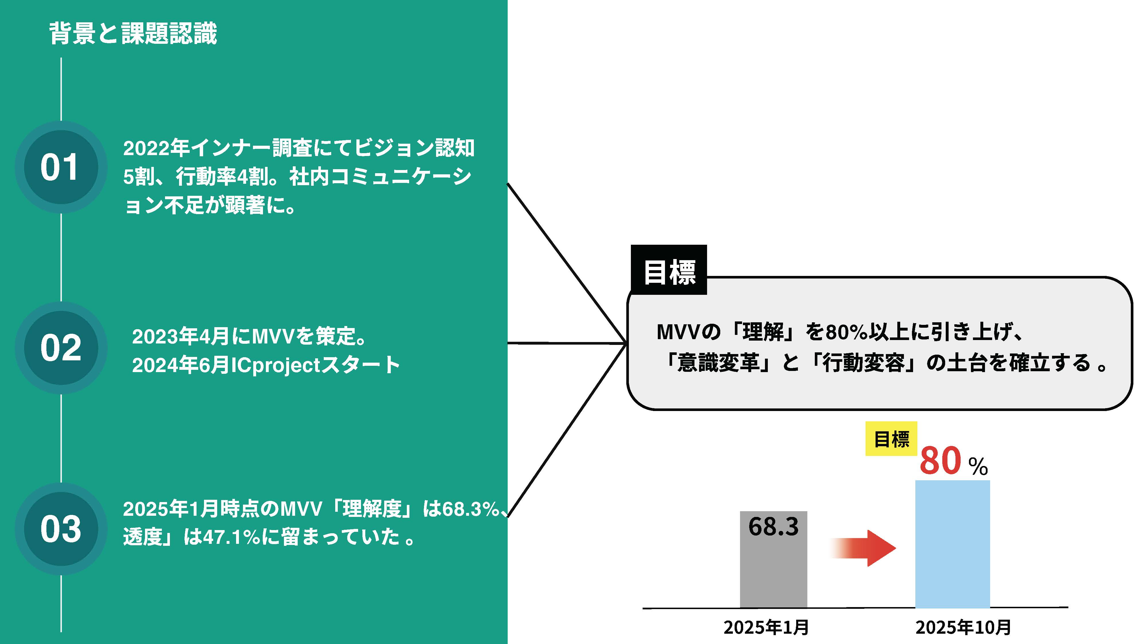 まず、「課題と目標」では、MVV浸透に取り組み始めた背景をお話ししました。