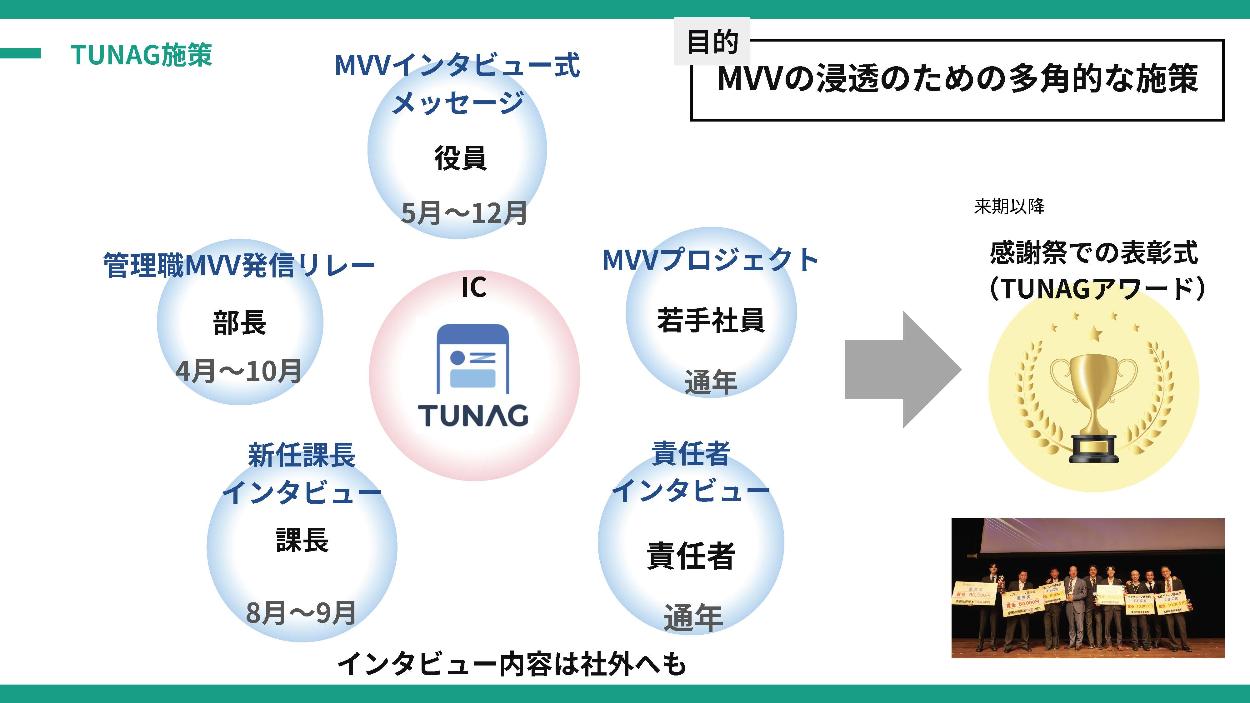 いずれの取り組みも、社員それぞれのMVVに関する個人的な考えやエピソードを、全社向けに発信することがポイントでした。発信者が特定の社員に偏ることを避けるため、役員から若手まで、あらゆる立場の人が発信する仕組みにしたことも、気をつけたポイントです。