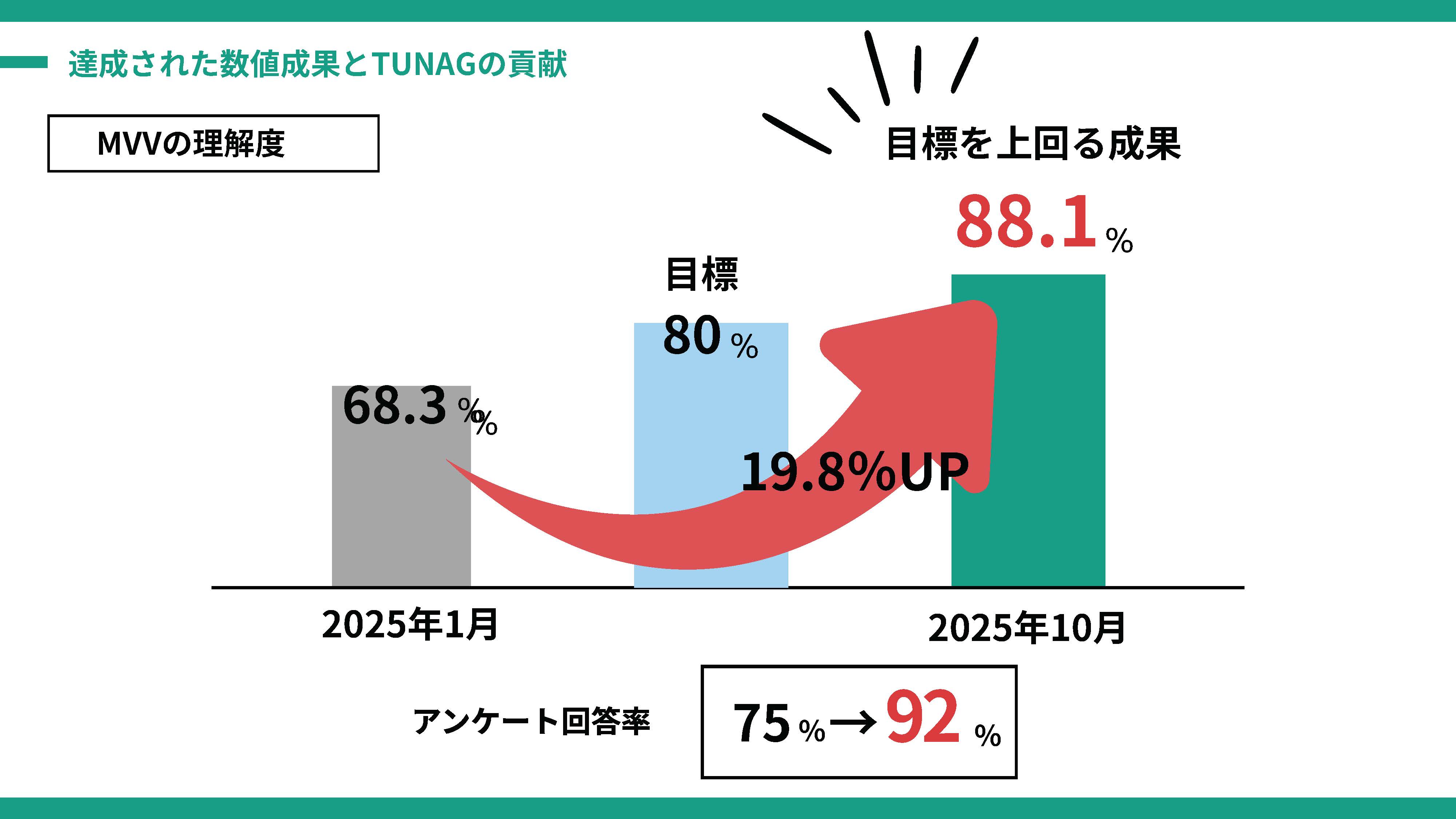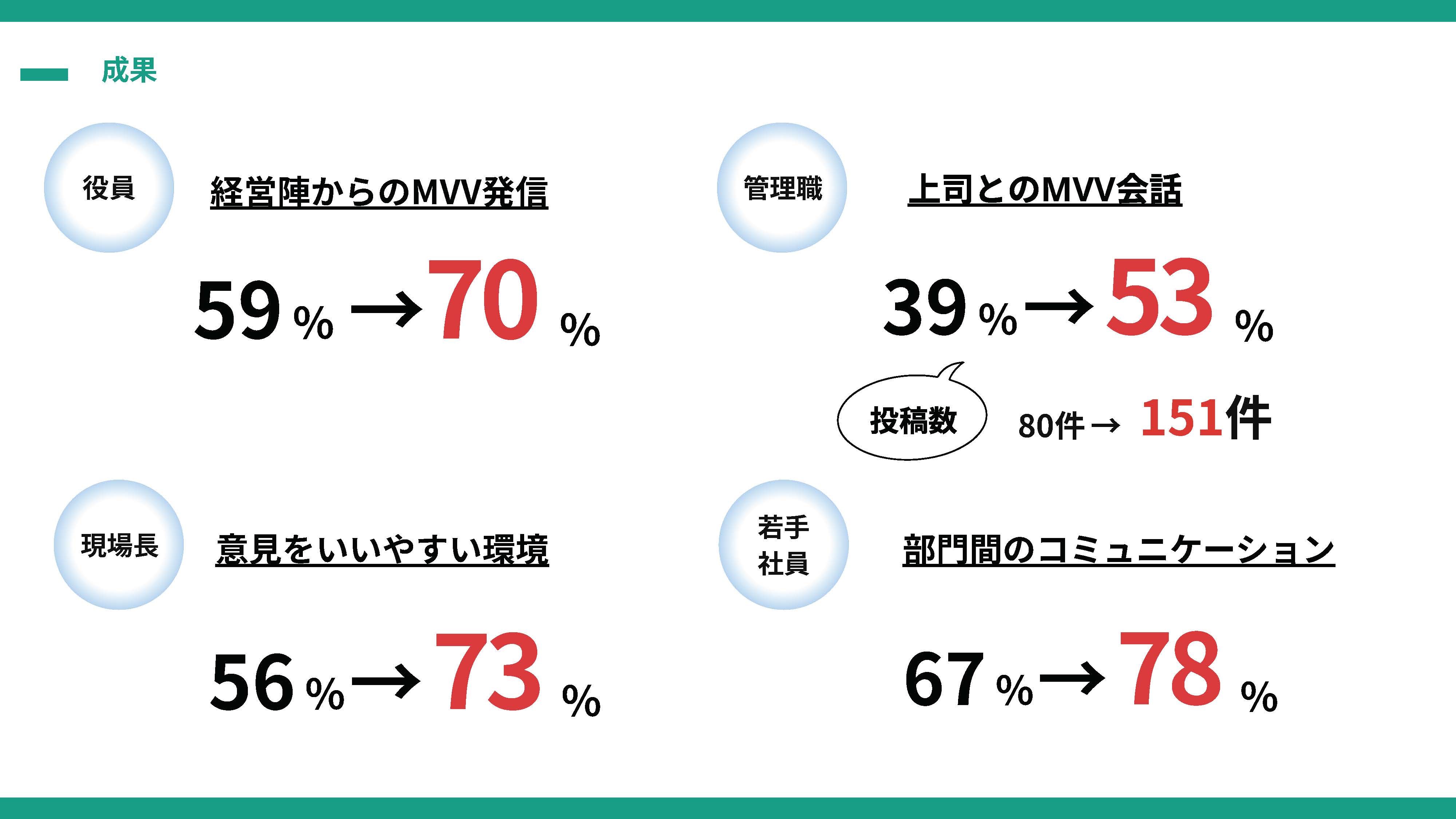 目標指標である「MVVの理解度」は、目標80%のところ88.1%と大きく伸ばせました。加えて、そもそもMVVに関するアンケートの回答率が大きく上がったことも、ポジティブな変化の表れとして発表させてもらいました。