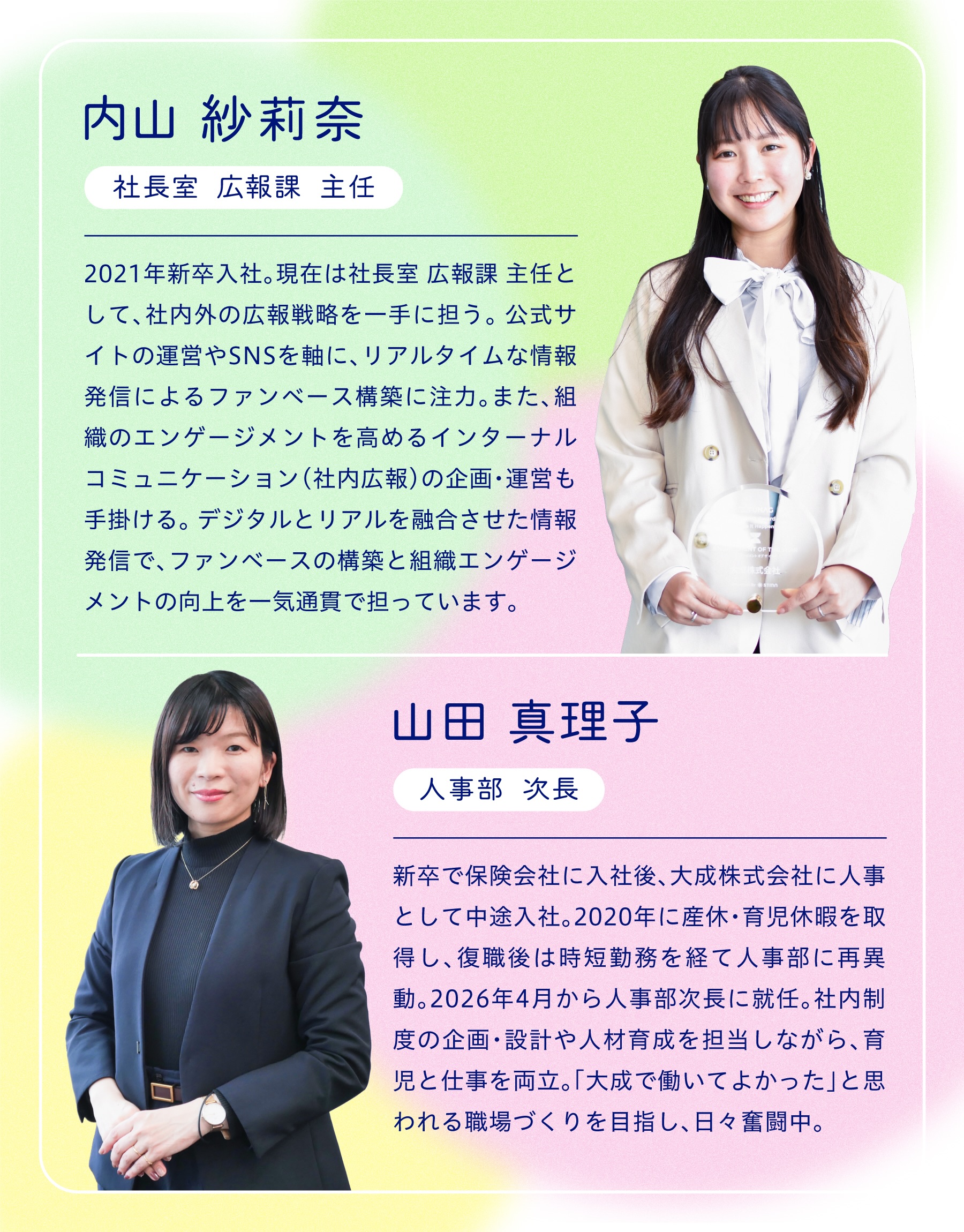 さらに、内側から湧き上がるこの熱量を「社外広報」へとつなげ、大成ブランドをより強固なものにしていきます。「大成らしさ」が溢れる会社を一歩ずつ創り上げていくことが、私の目標です。
